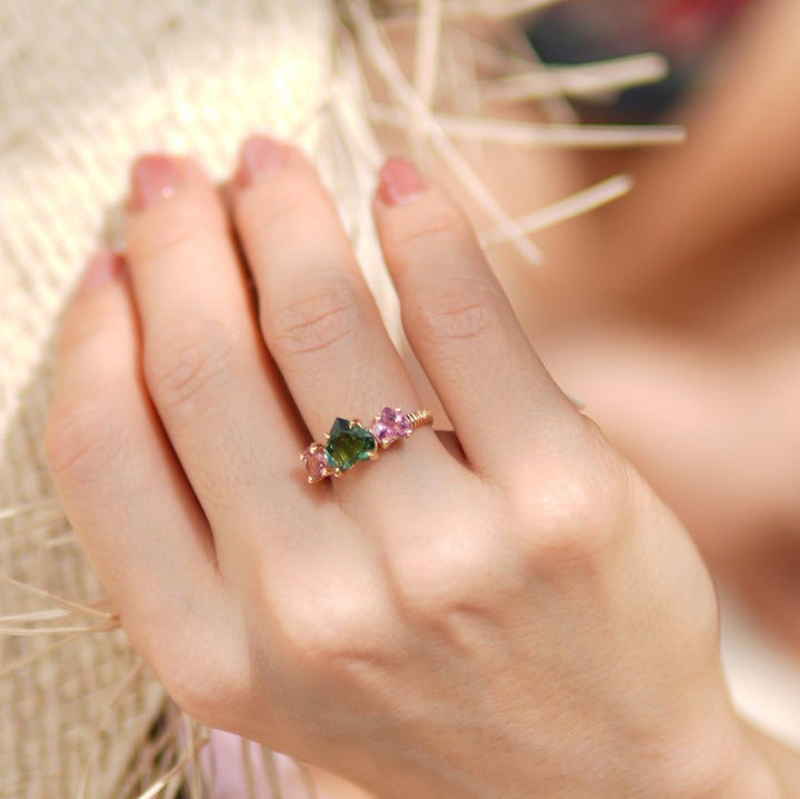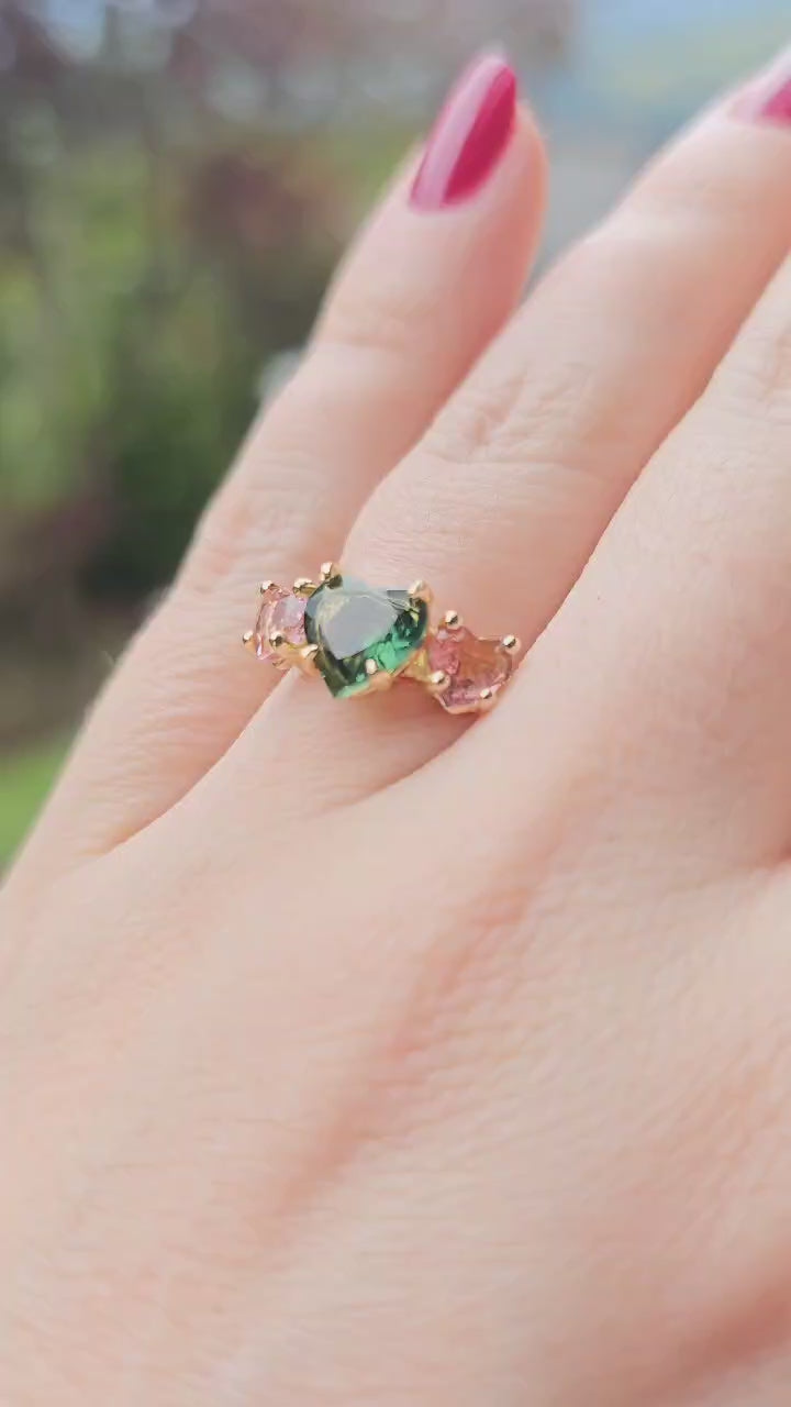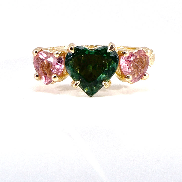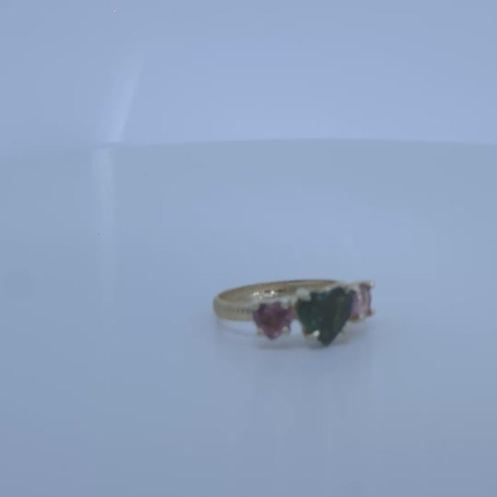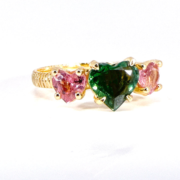 Corazón central en turmalina verde y corazones laterales en turmalina rosada.